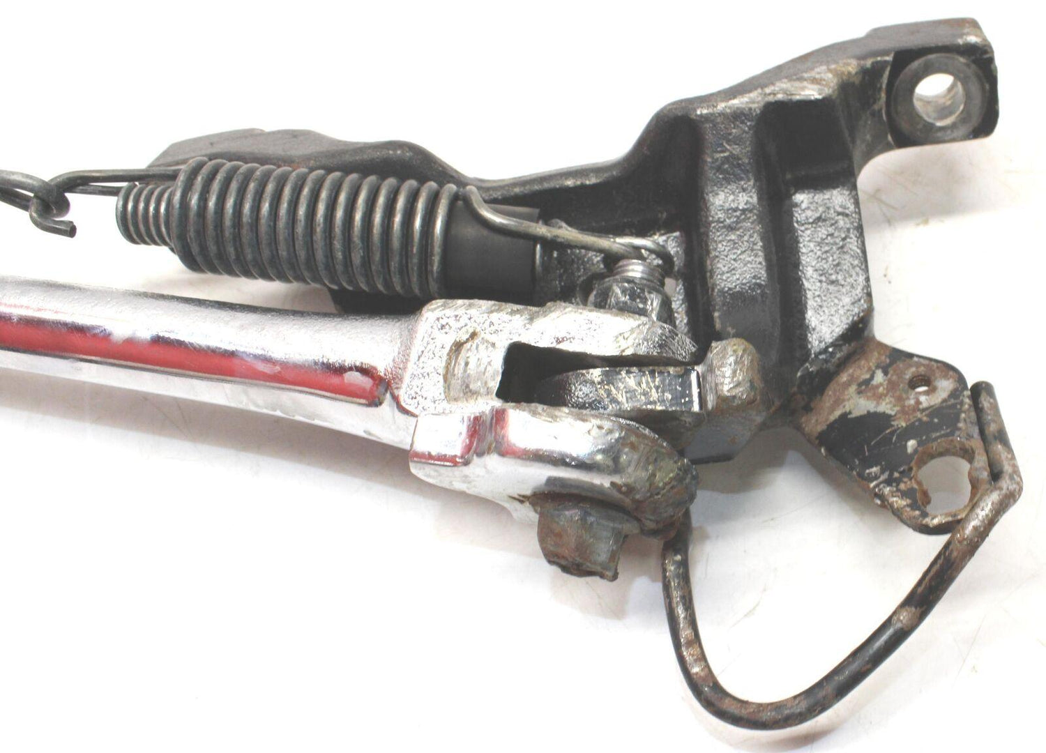 This kickstand is in used condition and shows normal signs of wear. The kickstand has light scratches. The kickstand shows signs of color fading. The kickstand has some rust as seen in pictures.