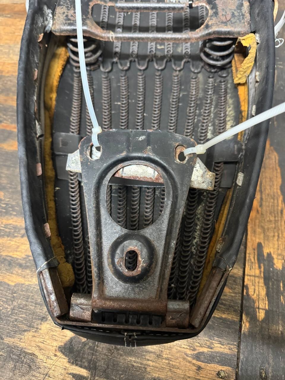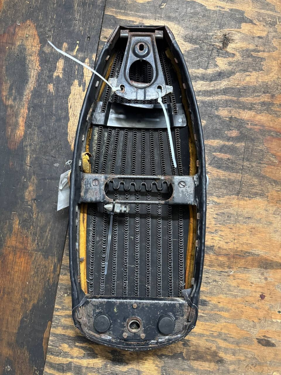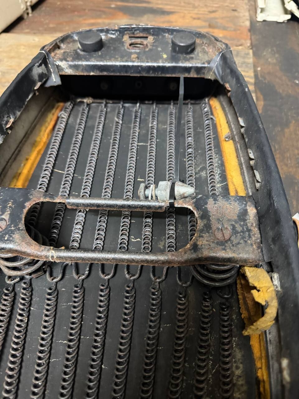 This front seat is in usable condition but has some minor damage. There are damaged spots and holes. Also has abrasions and rust. This comes as shown in the photos. Please view all photos closely for details. Thank you!