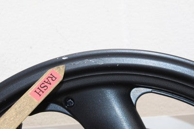 This front wheel rim has rash, minor rust bolts and shows normal signs of wear. Please view all photos closely for details. Thank you!